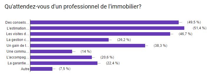 Pour 51% des votes exprimés, ce que l’on attend principalement d’un professionnel de l’immobilier est qu’il estime notre bien, donnée suivie de très près par le besoin de conseils juridiques et/ou techniques (50% des sondés).